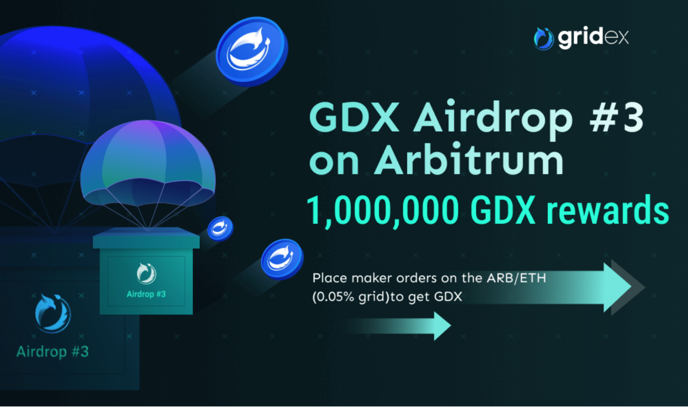 GDX Airdrop#3 akan dilakukan di jaringan Arbitrum dan pada pasangan perdagangan ARB/ETH (grid 0,05%). Dimulai pada 23 Maret 12:00:00 (UTC), dan berakhir pada 11 April 23:59:59 dengan total 20 hari. 50.000 GDX akan diberikan setiap hari.